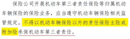 新规第八条中,明确提出险企“不得以机动车辆保险以外的责任保险主险或附加险承保机动车第三者责任”!