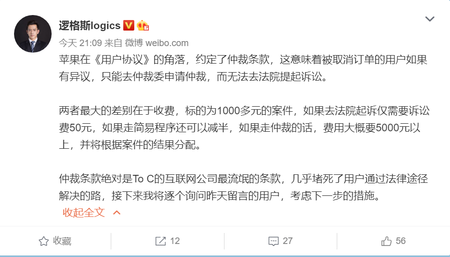 12月26日晚,律师博主@逻格斯logics表示,苹果在《用户协议》的角落,约定了仲裁条款,这意味着被取消订单的用户如果有异议,只能去仲裁委申请仲裁,而无法去法院提起诉讼。
