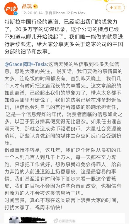 对此,@品玩 在微博回应:特斯拉中国行径的离谱,已经超出我们的想象力了,20多万字的访谈记录,这个公司的槽点已经不知道从哪儿开始说起了。我们唯一能做的就是进行后续跟进,给大家分享更多关于这家公司的中国分部的细节和故事。