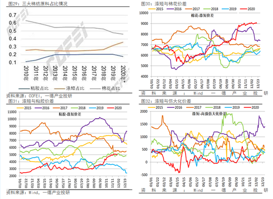 近几年三大棉纺原料结构中,棉花占比有所下降,短纤占比有所上升,粘胶持平。从价差结构中可以看出,棉花-短纤价差处于高位水平,明年棉花仍维持较好的基本面,带动短纤替代需求。粘胶与短纤价差低位回升,对于短纤需与价格求亦有一定的支撑。仿大化方面,由于原料的限制,目前涤短与仿大化价差仍维持低位,对于短纤需求仍是支撑(尽管这两年替代已经发生不少,边际替代效果在走弱)。