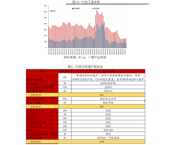 PX端来看,由于2019年PX产能的大幅投放,导致PX-PTA价差出现了大幅压缩,今年日韩一些短流程装置已经出现降负或停车。明年看浙石化二期500万吨PX预计在4-5月份释放,但是由于一季度已经有PTA装置产能释放(百宏+虹港+逸盛新材料),会造成PX阶段性供需错配,上半年PX加工差或有所修复。整体看明年国内PX的500万吨新产能亦难满足1190万吨的PTA新增需求,能够缓解PX当前的过剩格局。