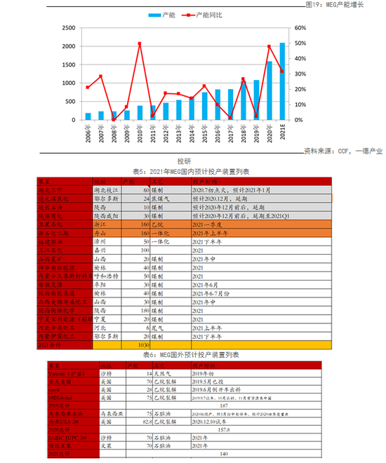 2020年做为MEG的产能投放大年,特别是大炼化恒力180万吨以及浙石化75万吨在年初投产后,MEG压力大幅增加。初步测算,MEG2020年产能增速47.75%。国外方面,2019年亦有新增产能,在2019年四季度开始已经逐步对我国形成新增供应,特别是美国,另外美国南亚一套82万吨装置近期投产。2021年我们保守估计MEG仍有550万吨左右的新增产能(包括卫星石化、浙石化二期以及今年推迟的一些煤化工产能),产能增速31%,预计产量增速26%,均大大高于聚酯增速。
