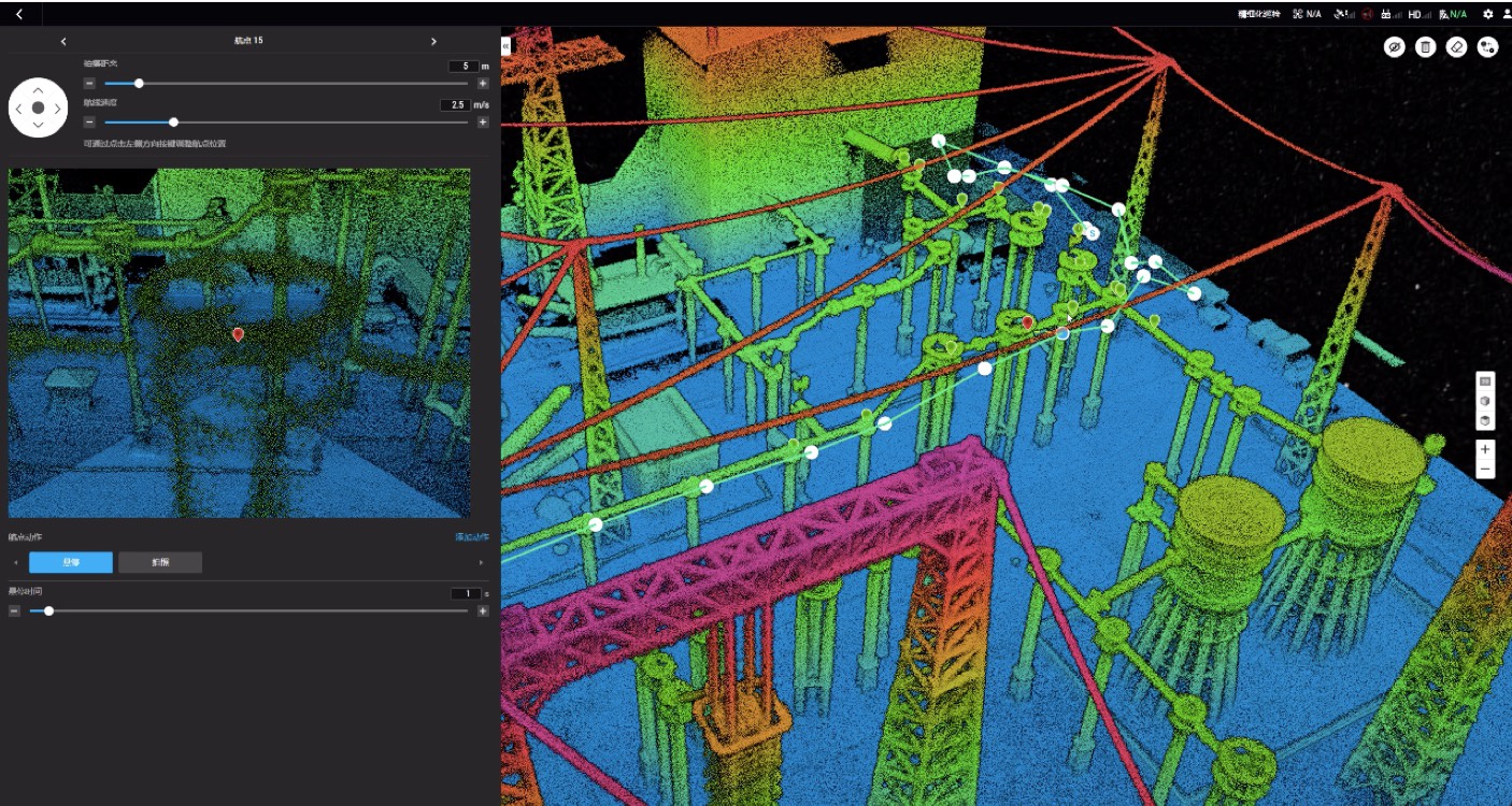 “在强电磁干扰环境下,使用大疆经纬M300RTK搭载L1激光雷达1个架次8分钟留空,即可完成长306米宽125米的区域数据采集工作。飞行结束后,通过大疆智图软件后处理,5分钟即可获取精细化三维模型。”邢晓明介绍道,上述步骤完成后,在大疆智图软件中打开厘米级精度的三维点云模型,根据巡检目标点,可设置无人机飞行距离、负载变焦倍数等参数,生成准确航线。与此同时,还可实现在软件中优化航线,保障避开敏感设备,帮助运维人员采取安全通道飞行。最终,在巡检环节,一线作业人员可一键自动飞行巡检,过程中无须再操控。与人工作业相比,在效率及质量两方面至少提升5倍以上。