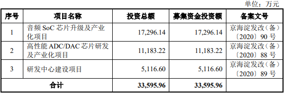 昆腾微原拟在上交所科创板公开发行股票数量不超过2866.67万股,占发行后公司股份总数的比例不低于25%,拟募集资金3.36亿元,其中1.73亿元用于音频SoC芯片升级及产业化项目,1.12亿元用于高性能ADC/DAC芯片研发及产业化项目,5116.60万元用于研发中心建设项目。