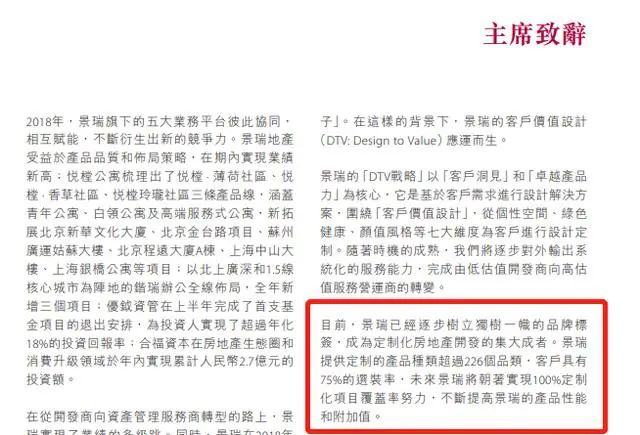 2019年,景瑞控股在年报中透露:“住宅定制化项目已达16个,定制产品种类超226个,可实现75%的选装率。”