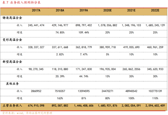 我们对公司业务进行拆分预测:变形高温合金毛利率较低,且在公司产品结构中的占比逐年降低,假设增速维持5%-10%;铸造高温合金逐渐成为公司主打产品,且平度产业基地即将投产,假设增速20%-25%;随着粉末高温合金的应用日趋成熟,新型高温合金业务有望快速增长,假设明年15%,以后维持30%-35%增速。基于上述假设,预计公司2020-2022年实现营收16.81/20.82/25.95亿元,归母净利润2.17/2.72/3.39亿元,EPS 0.46/0.58/0.72元,对应PE 75.44/60.32/48.35倍。高温合金材料具有高投入、高壁垒、高回报、长周期等特点,下游航空发动机放量带来高温合金高景气需求,公司作为国内高温合金龙头公司,享有较高的估值溢价。首次覆盖,给予买入评级。