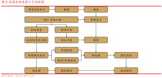 高温合金的成型工艺非常复杂:变形高温合金需要经过合金冶炼、锻造开坯、锻轧穿拔、精整、热处理、理化检验等;铸造高温合金首先需要制模,然后进行母合金冶炼、重熔浇注、精整、热处理、理化检验等;粉末高温合金需要进行母合金冶炼、粉末制备及处理、热等静压成形、等温锻造、热处理、理化检验等。