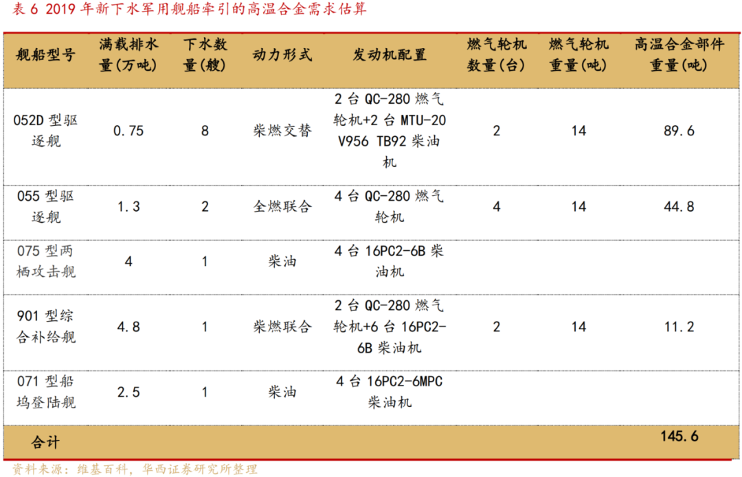 舰船:每年新下水军用舰船所用燃气轮机牵引的高温合金材料需求量为1456吨。