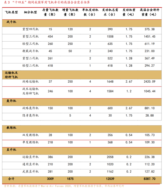 新机列装和旧机换发都对高温合金材料有着强烈需求。我们预计,“十四五”期间我国军用航空发动机需求牵引的高温合金部件为8387.70吨,按10%成材率测算,高温合金材料需求量为83877吨,年均16775吨。