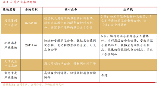 铸造高温合金:公司与航材院是国内唯二能够批量生产单晶叶片的单位。公司现有永丰、涿州两大铸造高温合金生产基地,青岛平度基地目前进展顺利,预计明年投产。