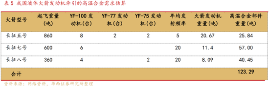 假设我国长征五号、长征七号、长征八号等新一代运载火箭的发射频率依次为5次/年、20次/年、20次/年,则每年我国火箭发动机中高温合金部件的重量约为123.29吨,按照10%成材率测算,对应每年高温合金材料的需求量约为1233吨。