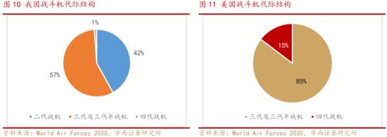 从战斗机的代际结构来看,我国军机结构性升级换装需求强烈。World Air Forces 2020发布的数据显示,目前我国战斗机以歼7、歼8为代表的二代机存量占比仍达42%,而美国空军二代机已经基本退役,目前已经形成以F15、F16等三代机为主,F22、F35等四代机为辅的格局,三代机和四代机的占比分别为85%和15%。“十四五”期间将是我国军机结构性升级换装的新时期,三代机基本完成对二代机的替代,成为空军战斗机绝对主力,同时,四代机也有望迎来加速列装。