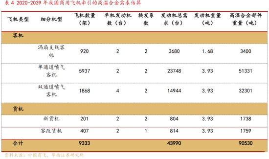 随着民用飞机国产化程度提升,未来民用航空发动机对高温合金的需求巨大。根据中国商飞发布的《2020-2039年民用飞机市场预测年报》,未来20年,中国航空市场将接收50座以上客机8725架,其中,50座级以上涡扇支线客机交付920架,120座级以上单通道喷气客机交付5937架,250座级以上双通道喷气客机交付1868架。未来20年,中国航空市场将接收货机608架,其中,按照国际市场新货机与客改货机的比例测算,新货机201架,客改货机407架。