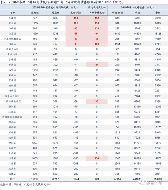 由表2可知,6个省“2020年再融资发行-到期”均小于“2019年地方政府债务限额-余额”。也就是说,新一轮再融资债,即使全部用于置换隐性债务,也不会突破地方政府债务限额。