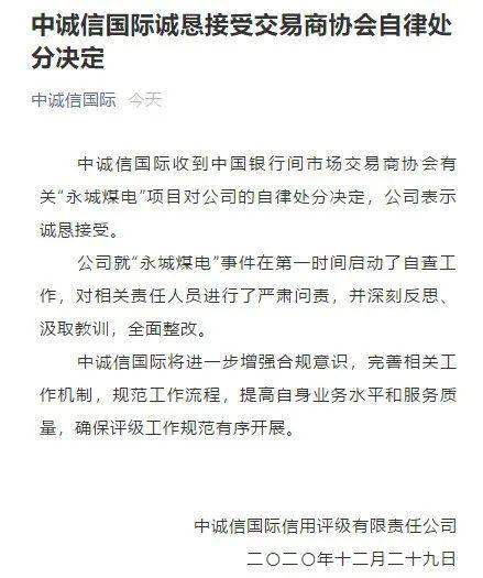 中诚信国际在随后发布的声明中表示,中诚信国际收到中国银行间市场交易商协会有关“永城煤电”项目对公司的自律处分决定,公司表示诚恳接受。公司就“永城煤电”事件在第一时间启动了自查工作,对相关责任人员进行了严肃问责,并深刻反思、汲取教训,全面整改。中诚信国际将进一步增强合规意识,完善相关工作机制,规范工作流程,提高自身业务水平和服务质量,确保评级工作规范有序开展。