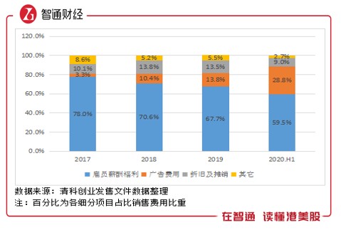 智通财经了解到,2017-2019年期间,清科创业销售费用率一直处于下降趋势,2019年为6.2%,相比于2017年下降了2.1个百分点,2020年受疫情影响,线下活动受到了阻碍,增加了较大的广告费用,费用率上升至14.1%。从销售费用构成看,按计划雇员薪酬比率将得到提升。
