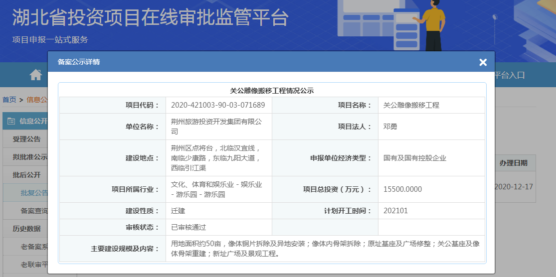 湖北省电子招投标交易平台截图据湖北省投资项目在线审批监管平台显示,荆州区发展和改革局2020年12月17日批复的“关公雕像搬移工程”已审核通过,项目总投资为15500万元,计划开工时间为2021年1月。