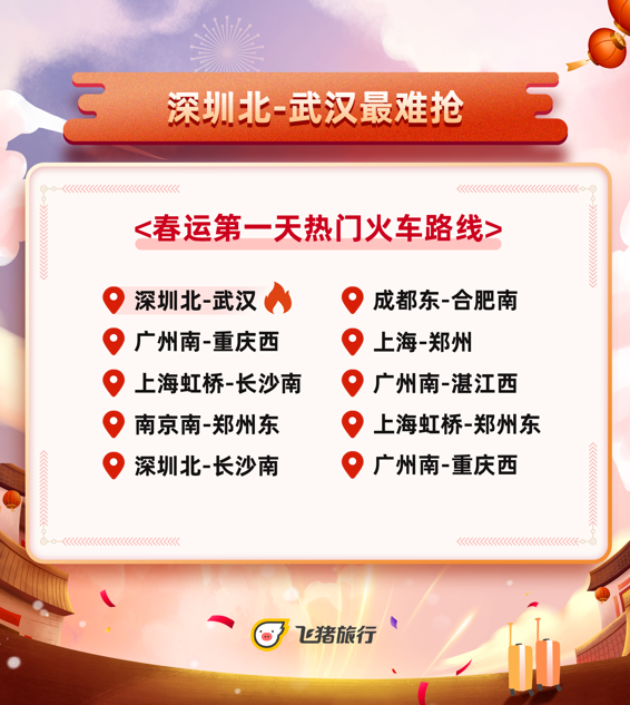 深圳北-武汉连续多年位居最难抢的火车票第一位,今年也不例外。加上去年春节没能过好年,今年湖北人回家格外积极,武汉为到达站的车段票排在热门线路第一。