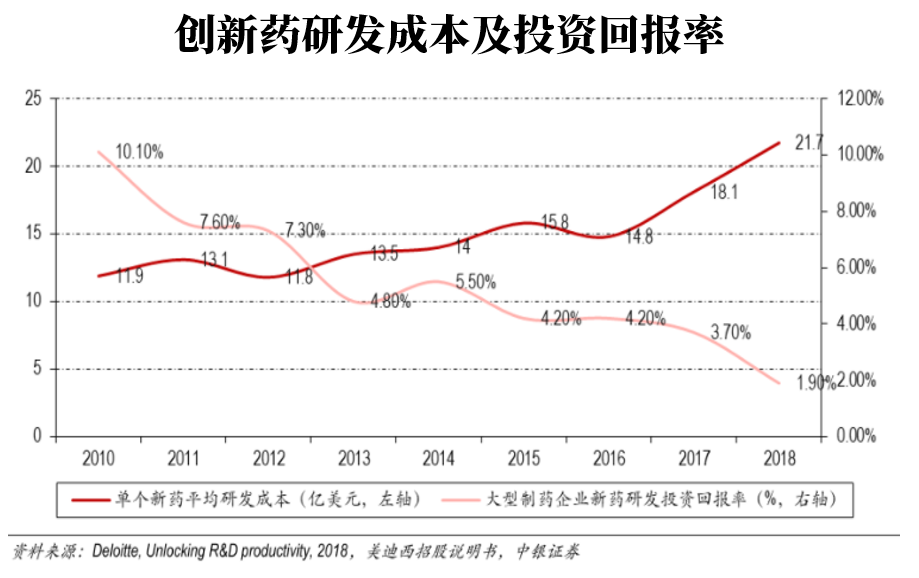 研发出一款重磅药品的回报固然可观,但是对于这些不差钱的跨国药企来说,研发费用越来越高,但是回报率却越来越低,主要有2个原因: