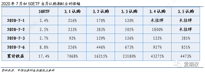 月初四个交易日(7.1-7.6)市场大涨,投资者情绪强烈乐观,IV短时间内飙升至35%,认购期权四个交易日价格上涨百倍,仅1%资金投入认购期权就可以使总资金翻倍。随后至7月末,市场经历回调,IV有所回落,但仍处于27%的相对高位。此间最佳的做法之一就是我们过去多次强调的顺行情止盈调整认购持仓合约。