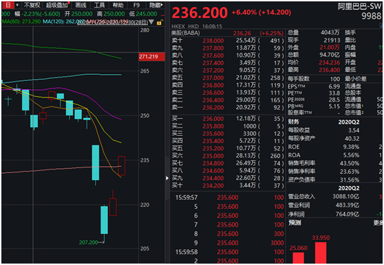 阿里巴巴港股大涨超过6%,收盘报236.20港元。