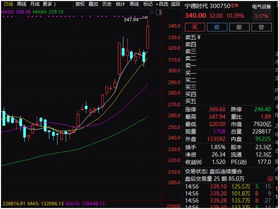 这里面最为突出的要数宁德时代。行情数据显示,宁德时代全天维持强势,盘中一度上涨近13%,截至收盘,宁德时代报340元,较上一交易日上涨10.39%。