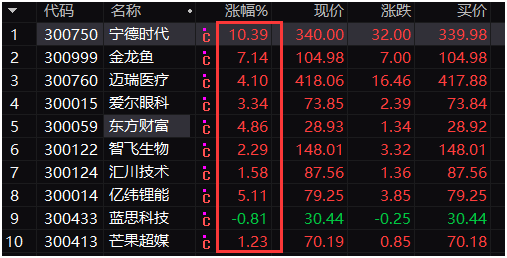 宁德时代的走强带动其他创业板股票交投氛围,权重股纷纷走强,市值排名前4的创业板权重股全都创下历史新高。