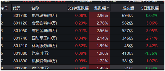 具体板块方面,电气设备、食品饮料、有色金属、休闲服务、汽车等板块涨幅居前。