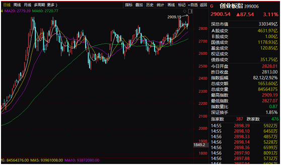 表现最为突出的还是创业板指,该指数时隔5年重新站上2900点大关,收盘报2900.54点,大涨3.11%,指数呈现突破之势。美中不足的是,创业板全天成交1654亿元,成交额较前一交易日有所缩小。