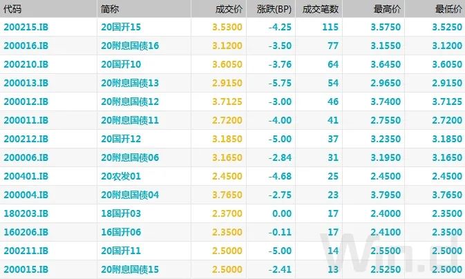 银行间主要利率债收益率下行3-5bp,5年期下行幅度最大。10年期国开活跃券200215收益率下行4.25bp,5年期国开活跃券200212收益率下行5bp;10年期国债活跃券200016收益率下行3.5bp,5年期国债活跃券200013收益率下行5.75bp。