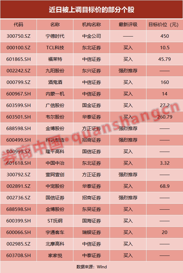 据统计,其中12月30日,东兴证券对九阳股份(002242.SZ)的评级由“推荐”提升至“强烈推荐”,中信证券对福莱特(601865.SH)的评级由“增持”提至“买入”,目标价45.79元;12月28日,中信证券对个股酒鬼酒(000799.SZ)和内蒙一机(600967.SH)的评级由“增持”提升至“买入”,目标价位分别是160元和14元;12月27日,华泰证券对韦尔股份(603501.SH)的评级由“增持”提升至“买入”,目标价位260.79元。