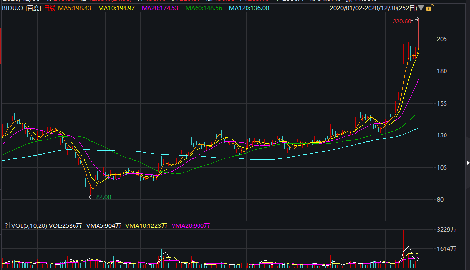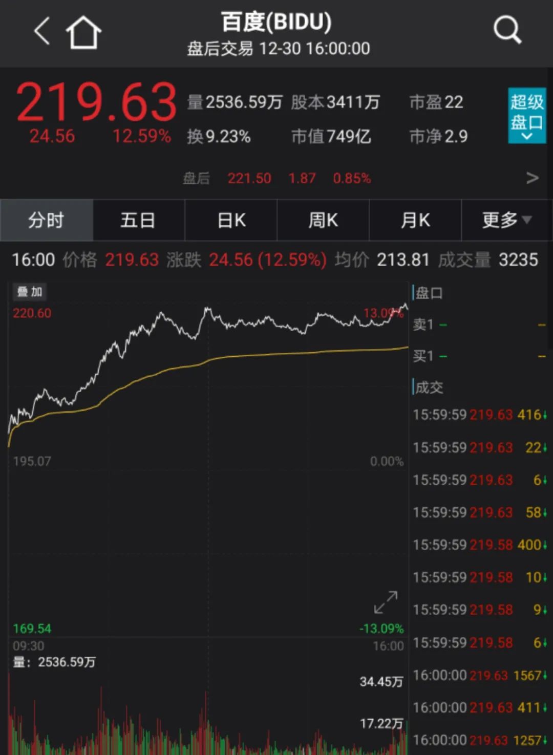 百度表现同样强势,截至收盘涨幅扩大至12.59%,市值较前一日增加84亿美元,约合人民币548亿元。