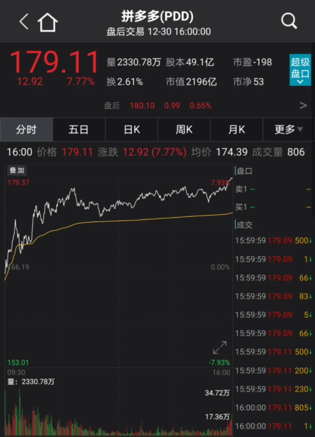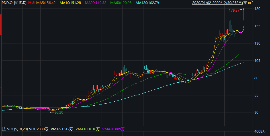 从今年整体表现来看,拼多多一路飙升,从年初的不到40美元狂涨近340%至最新收盘的179.11美元,涨幅排名第一。