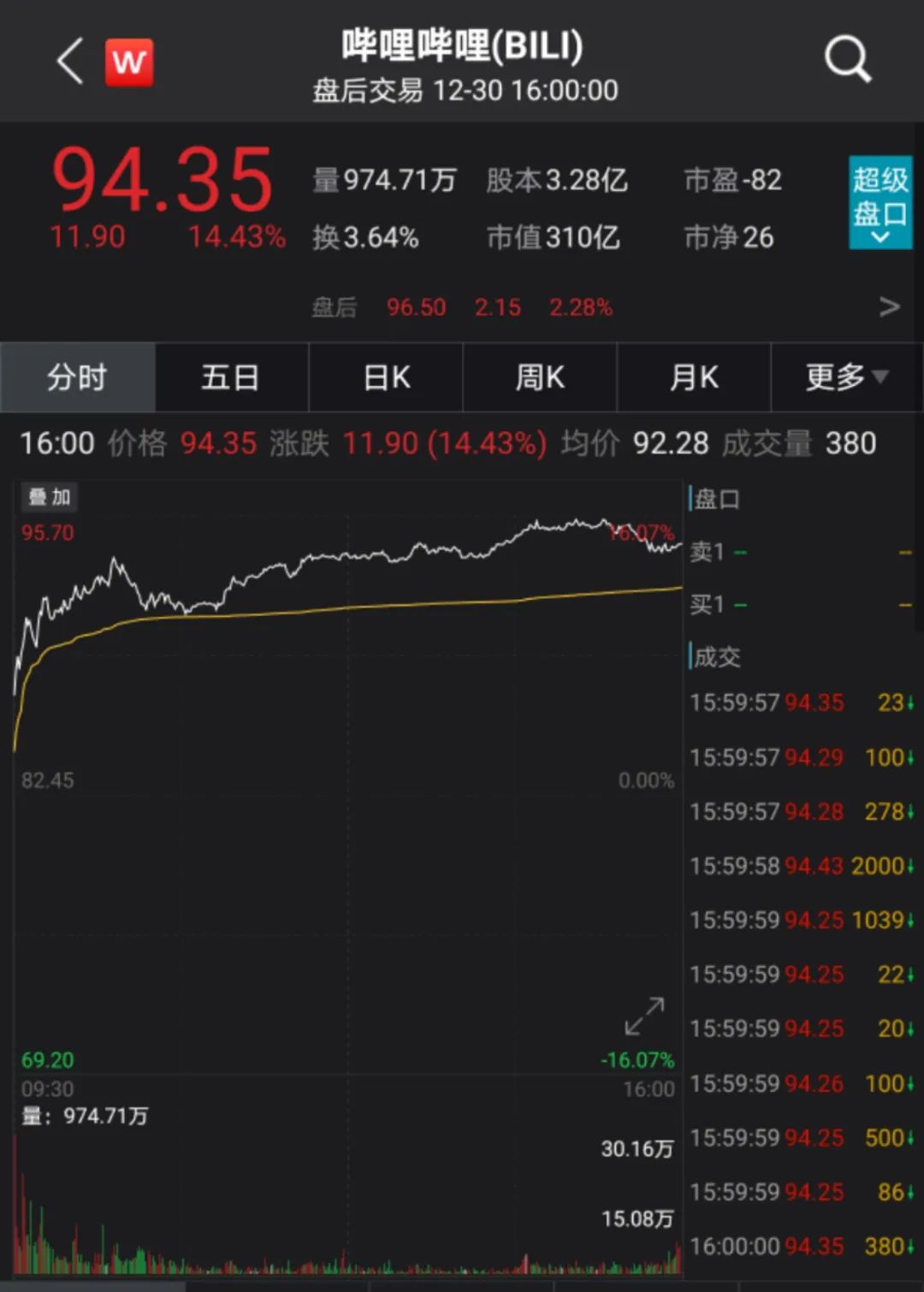 B站跳空高开5.6%,随后涨势如虹,收盘大涨14.43%,市值达到310亿美元,较前一交易日增加40亿美元,约合人民币261亿元。