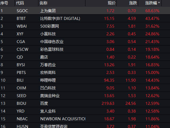 此外,京东上涨3.92%报收89.52美元,阿里巴巴上涨0.90%报收238.39美元;500彩票网飙涨32.58%报收7.61美元,小赢科技大涨25.41%报收2.27美元,趣店上涨17.80%报收1.39美元宜人贷上涨12.25%报收3.39美元,嘉楠科技上涨10.05%报收4.38美元。