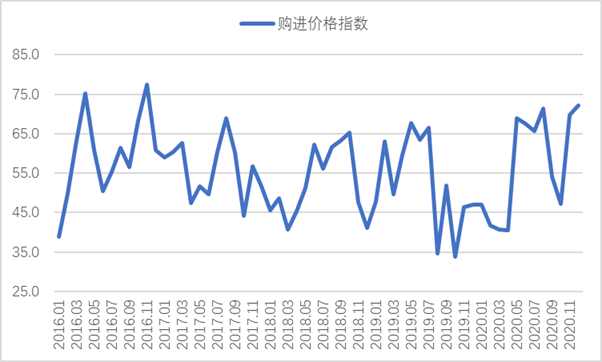 2020年,原材料购进价格和产品销售价格呈现联动较快上升走势。原材料价格方面,一季度内由于疫情影响生产,钢厂采购意愿较弱,原材料价格下行,购进价格指数处于相对低位。进入二季度后,钢材市场较快恢复,钢材采购趋增,带动原材料价格上升,购进价格指数进入快速上升阶段。下半年,国际矿商由于新冠疫情、自然灾害、贸易政策等多种原因,铁矿石供给不确定性持续较大。其他主要原材料价格也持续较大波动。5月以来,多数月份购进价格指数都运行在65%以上的高位,企业成本高企。钢材价格方面,由于成本拉动,以及市场需求稳中有升,钢材销售价格也呈持续趋势,其中前十个月呈现小幅震荡上行态势,上海螺纹钢指数显示,从春节后到10月份仅上涨300元/吨。11-12月份,钢材价格出现明显上升,创出两年内新高。由于原材料和产品价格保持同向增长,企业效益有所保障,据中钢协估计,今年钢厂累计利润有望追赶去年同期。
