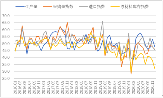 图42016年以来生产指数、采购量指数、进口指数和原材料库存指数变化情况