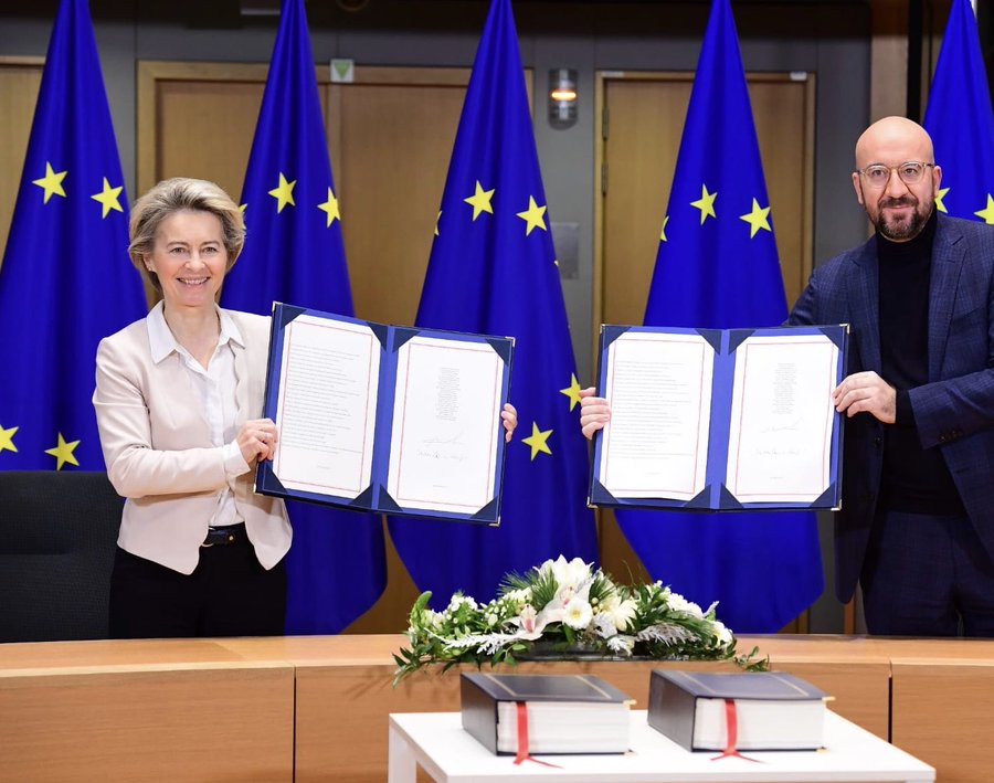 欧盟委员会主席冯德莱恩和欧洲理事会主席米歇尔,在当天早些时候已签署这份1246页的欧盟与英国贸易与合作协议。两人进场后仅用了3分钟左右就完成签署仪式,随后协议被送至英国伦敦。“鉴于欧盟和英国的关系已开启新的篇章,最重要的是向前看,”欧盟在一份声明中说。