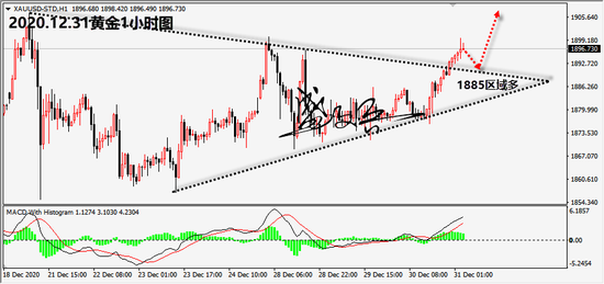 黄金策略:1885区域多,止损1876,目标1900,1906,1913