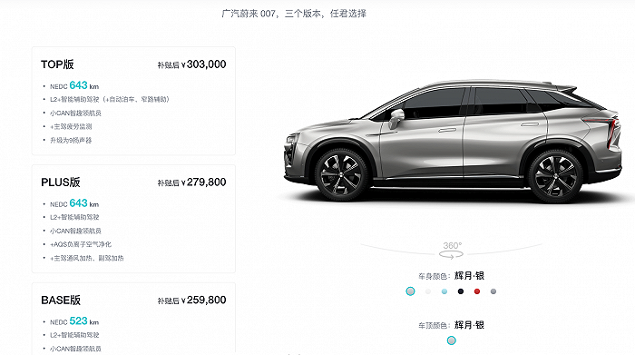 广汽蔚来HYCAN 007是一款纯电动SUV,补贴后售价区间为25.98至30.3万元,NEDC续航里程有523公里和643公里两种。