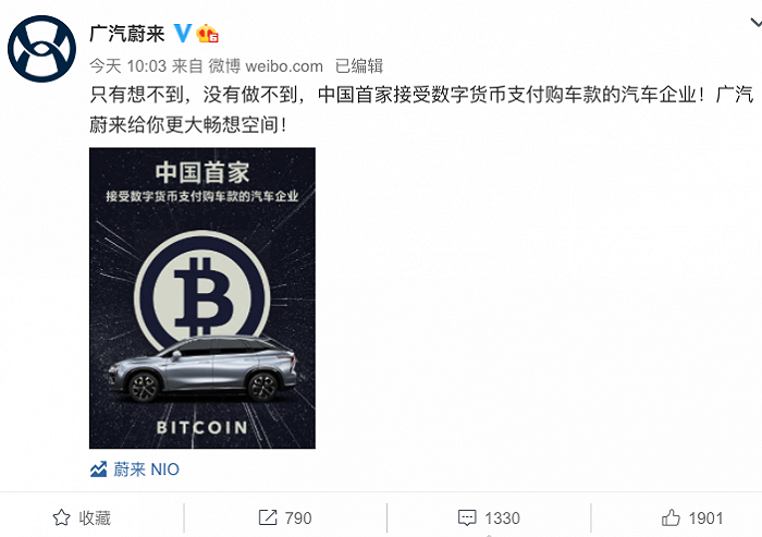 很快,广汽蔚来修改了这种说法,将“比特币”更改为“数字货币”。由此,广汽蔚来成为中国首家接受数字货币支付购车款的汽车企业。