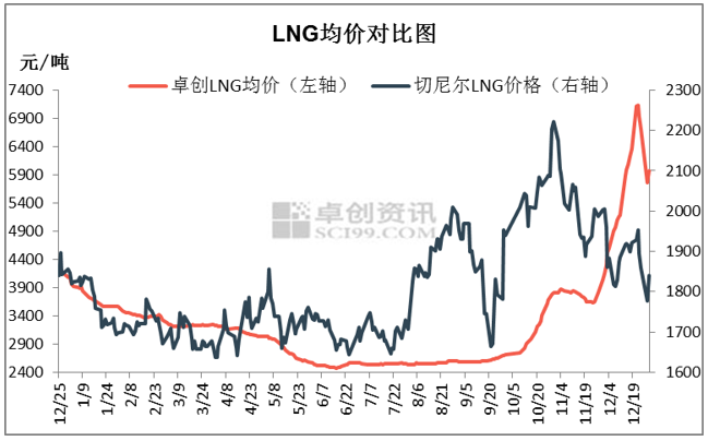 冷空气来临,LNG价格走势震荡。卓创资讯对全国218家LNG工厂的监测数据显示,截至本周三(12月30日),开工厂家121家,LNG工厂周均开工率为37.42%,环比上周减少2.22%。LNG工厂周均日产为5054万立方米,环比上周减少115万立方米。