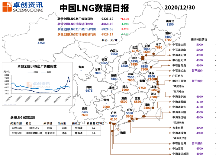 截至2020年12月30日,LNG市场均价为6109.54元/吨,环比上周下跌646.88元/吨,跌幅9.57%。本周国内LNG市场呈现明显的震荡局面。北海接收站预计于2021年1月1日恢复出液,其他接收站近期LNG出货量亦有所增加,供应短缺局面有一定程度的缓解,而由于此前价格的高位运行,终端用户的抵触心理渐强,接货的乏力促使前一阶段部分液厂开始将价格进行下调;后一阶段寒潮来袭,国内大部分地区尤其是北方气温大幅下降甚至出现大面积雨雪天气,天然气供暖需求的增加再次对价格形成一定刺激,多数LNG工厂计划仍然偏于紧张,价格上涨现象仍存。