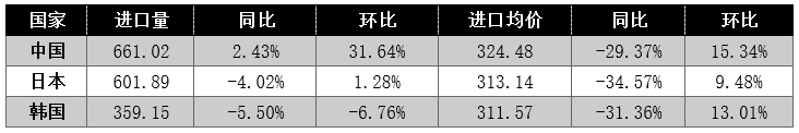 11月份中国LNG进口量661.02万吨,同比上升2.43%,环比上升31.64%;日本LNG进口量601.89万吨,同比下降4.02%,环比上升1.28%;韩国LNG进口量359.15万吨,同比下降5.50%,环比下降6.76%。从进口均价来看,中日韩三国进口均价同比都有不同程度下滑,这也反映出目前国际市场延续了天然气现货比例较大、供应相对宽松的现状,预计进口均价的下跌将在一定程度上刺激进口量的增长。