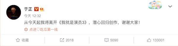 “尊敬的琼瑶老师:关于《宫锁连城》侵犯《梅花烙》版权一事,我诚挚地向您道歉!”“从今天起我将离开《我就是演员3》,潜心回归创作,谢谢大家!”12月31日中午前后,编剧于正连发两条微博,先就此前的侵权事件向琼瑶致歉,接着宣布退出热门综艺节目《我就是演员3》的导师席位。