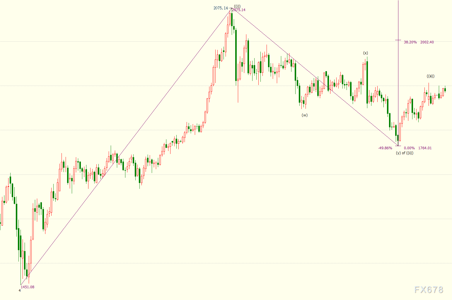 日线图上看,金价自1764美元开启上行((iii))浪走势,((1))浪是((iii))浪的三级子浪。((iii))浪的23.6%和38.2%目标位分别在1911美元和2002美元,((iii))浪是自1451美元开启的上行5浪的子浪。