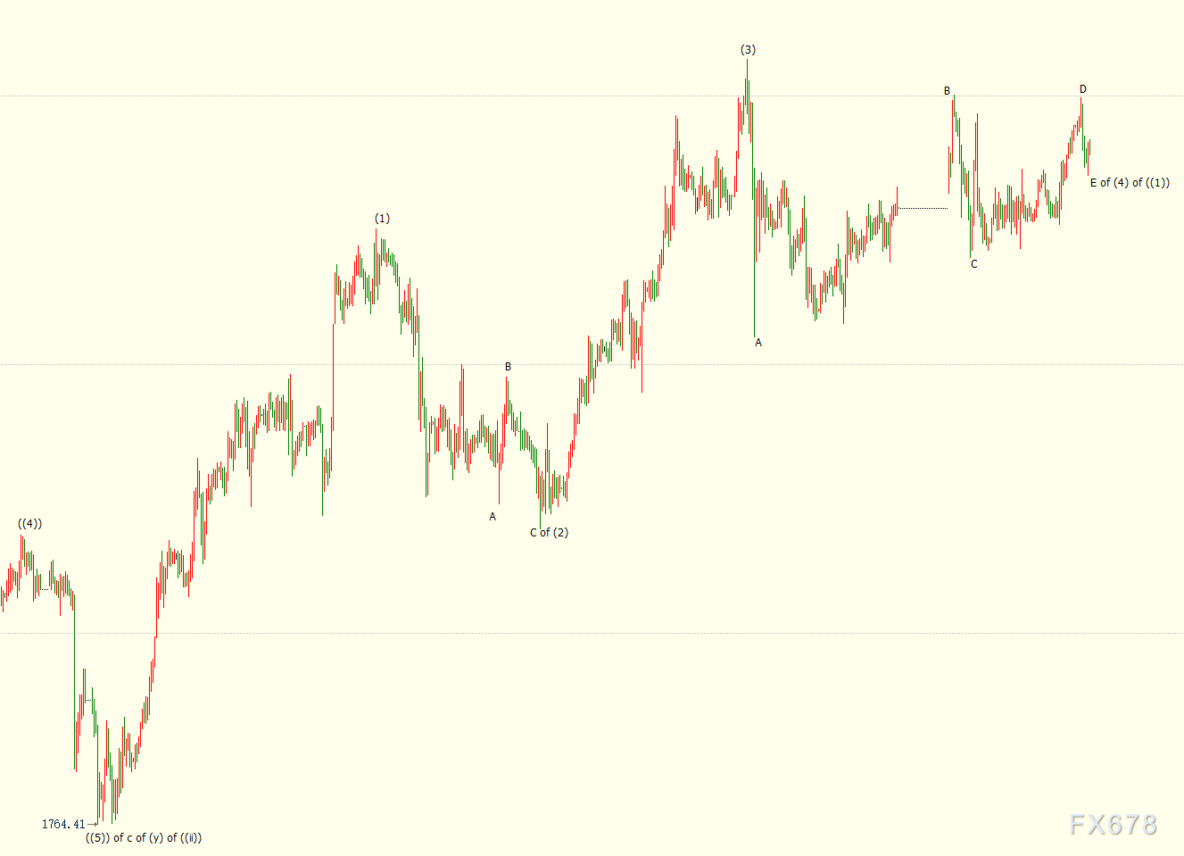 金价或即将结束自1907美元开启的调整(4)浪,并开启上行(5)浪走势。(4)浪呈现横盘收敛震荡态势,可细分为ABCDE五个子浪。(4)浪和(5)浪都是自1764美元开启的上行((1))浪的子浪。