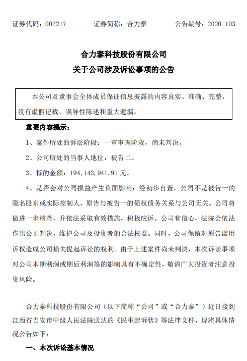 12月23日,合力泰发布公告称,中建八局因工程建设合同纠纷,向江西吉安中级人民法院起诉益丰泰公司、合力泰、文开福、王婷华、朱芷幸,要求法院判决与益丰泰解除合同,并判令益丰泰支付剩余工程款及违约金1.94亿元。