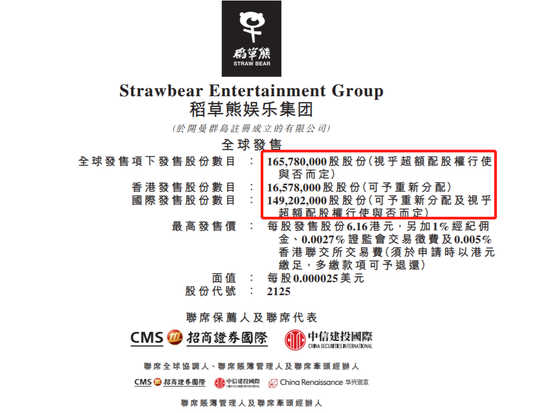 12月31日,稻草熊发布全球发售公告及招股说明书,计划全球发售1.658亿股股份,其中约1.492亿股发售股份将用作国际发售,其余约1657.8万股发售股份将作香港发售,作价每股5.10港元至6.16港元,最高募资总额为10.21亿港元。