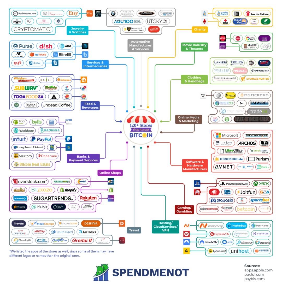 早在2020年前,以比特币支付的商业版图就已经初见成效,下图是Spendmenot根据Paxful和Paybis的数据发布了一份综合报告。该图展示了比特币在商业银行、通信、网站、奢侈品、慈善以及服务行业等不同领域的支付情况。